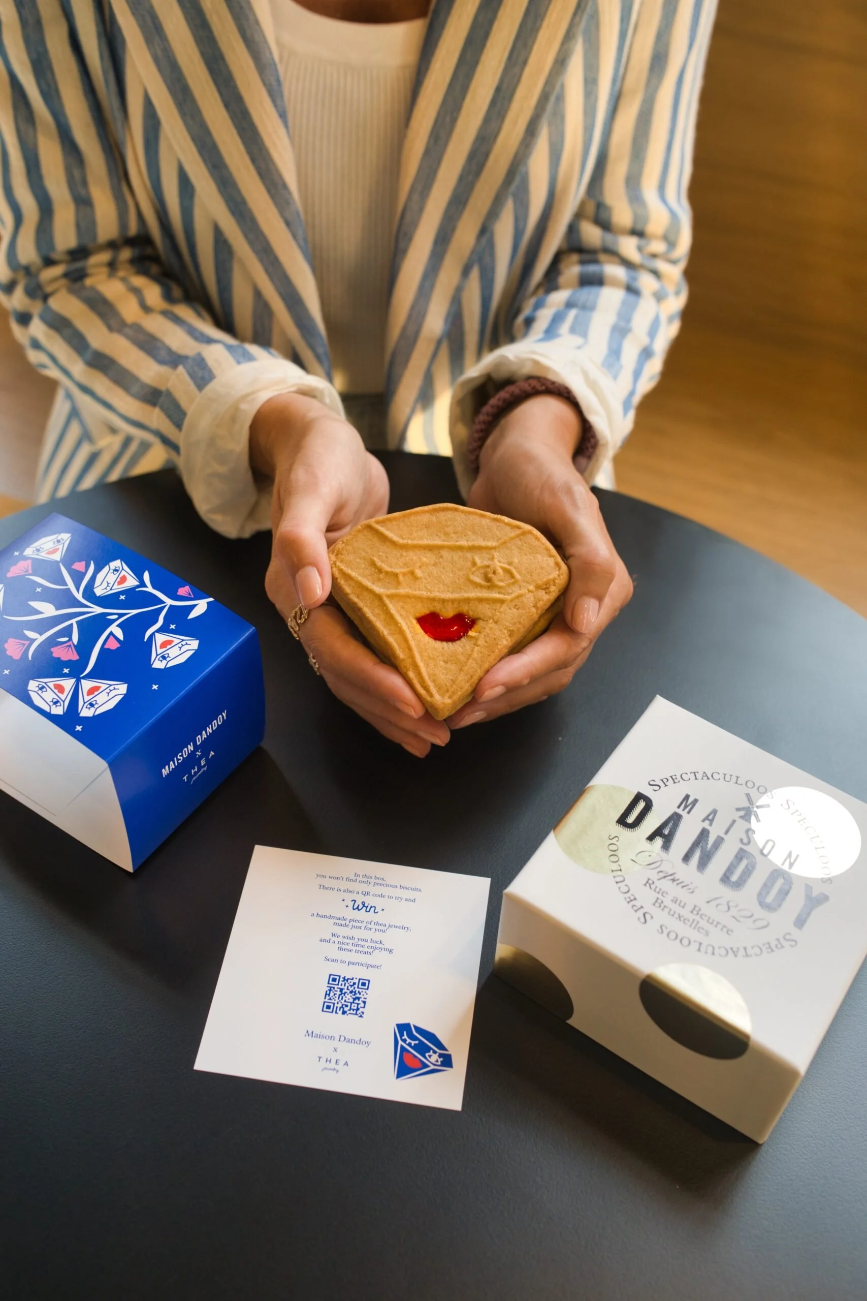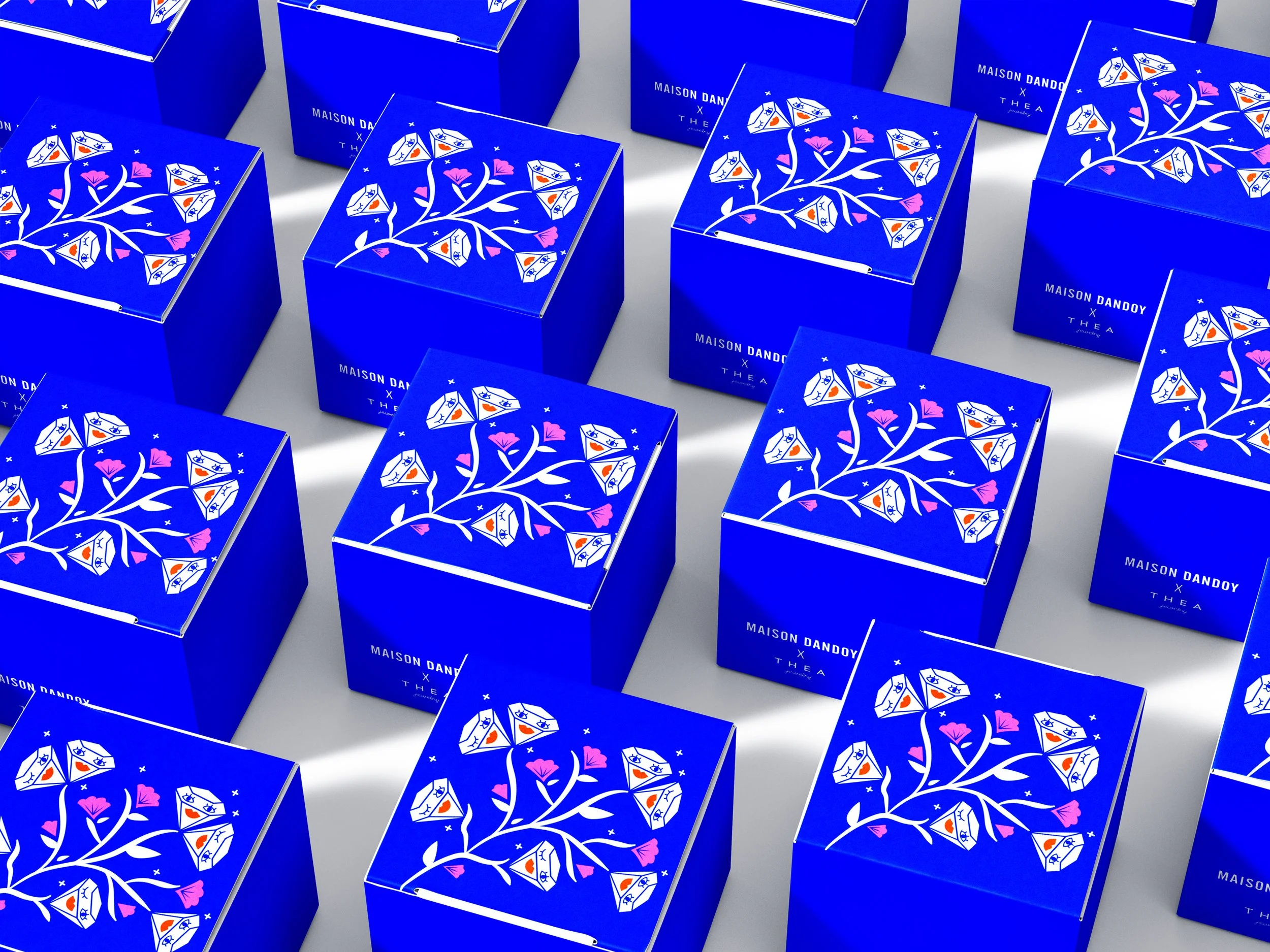 I designed the packaging for the Dandoy x Thea jewelry collab for Valentine's day. The Dandoy vanilla cookies were in shape of diamonds winking faces with red jelly lips. I decided to create a graphic tree illustration with the diamond in yves klein blue, red and pink tones.